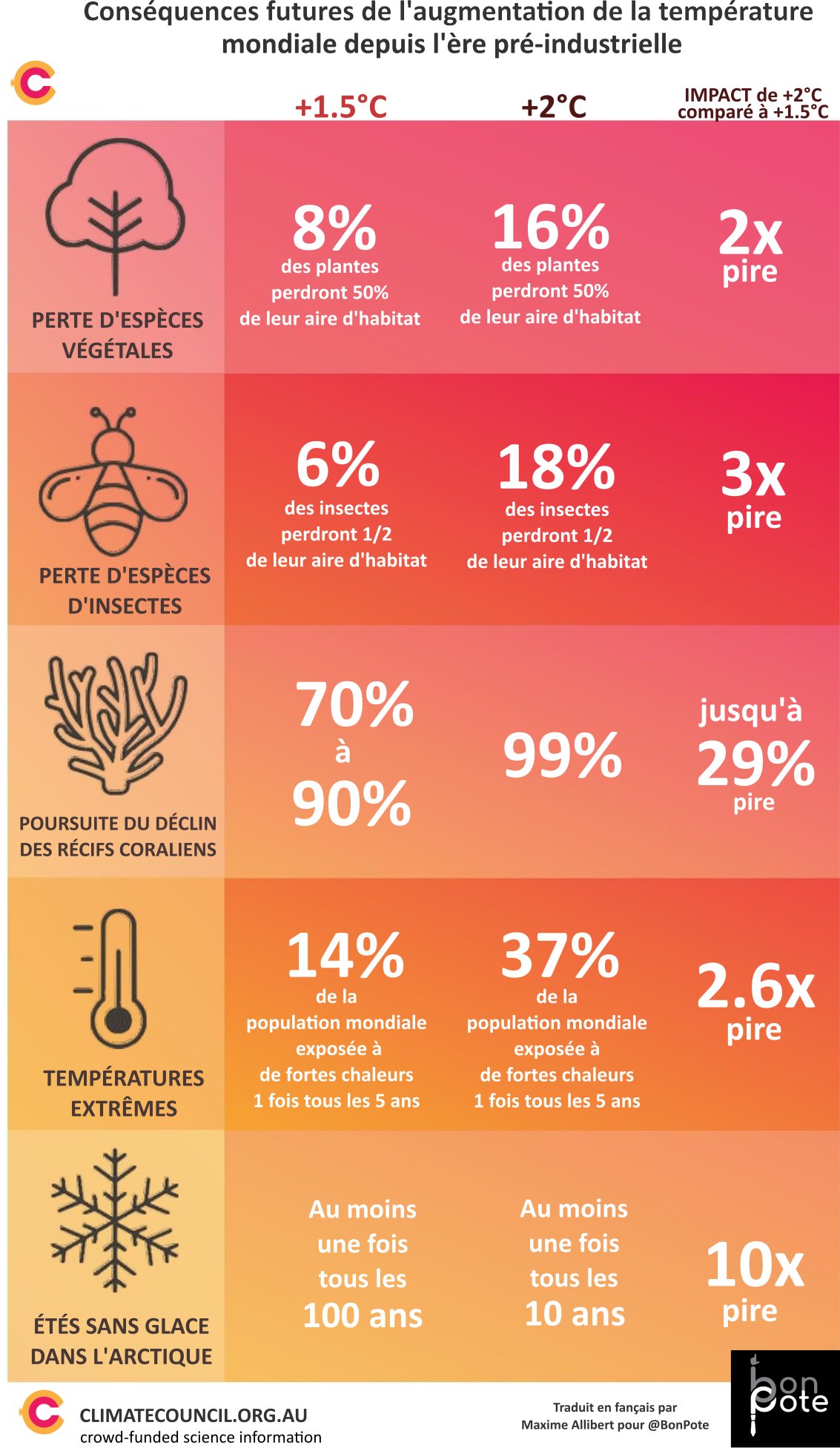 Or, chaque dixième de degré supplémentaire démultiplie les impacts (comme le montre bien cette infographie), avec pour conséquences : davantage de vagues de chaleurs, des stress hydriques, une hausse du niveau des mers de plus d’un mètre, une aggravation de la perte de biodiversité, etc. De manière très concrète, dans un monde à +2°C, d'ici à 2100, le climat de Liège devrait être semblable au climat actuel de Toulouse.